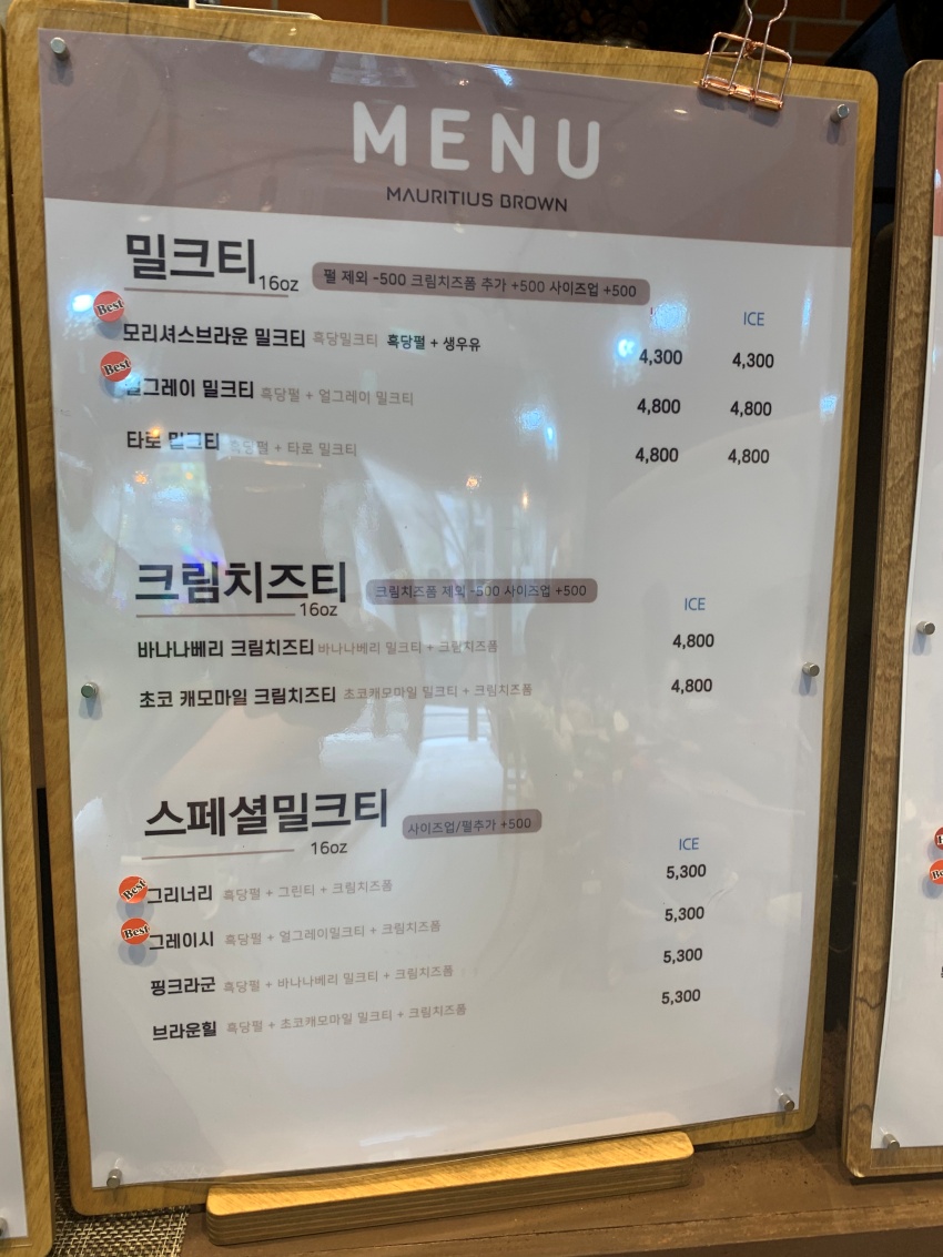 흑당 밀크티를 메인으로 타로,얼그레이등의 밀크티에 크림치즈 밀크티와 스페셜 밀크티가 준비되어있습니다.