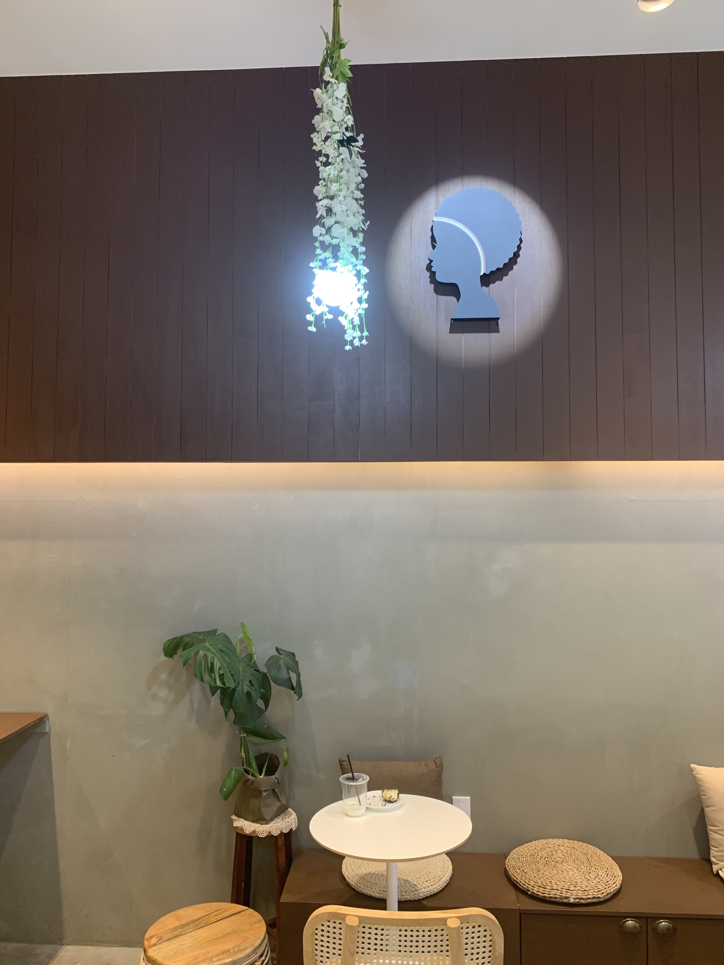 송내 이쁜 카페 모리셔스 브라운의 분위기는 화이트로 깔끔한 느낌인데 차가와 보일 수 있는 인테리어를 보완하기 위해 패브릭과 조명 소품들이 아기자기하게 진열되어 있었습니다.