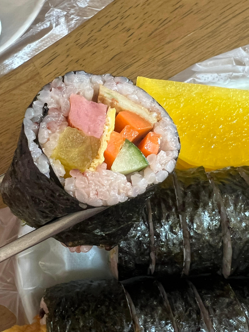 두 번째, 밥입니다. 흔한 김밥처럼 보이지만, 만포분식 김밥은 밥이 흑미밥이라는 점! 김밥은 흑미밥이란것을 빼고는 딱히 다른곳과 다르지 않았어요. 기본에 충실한 맛이라고나 할까. 그래도 떡볶이 소스에 푹 찍어 먹으면 그야말로 극강의 단짠 조합이 완성되었어요.