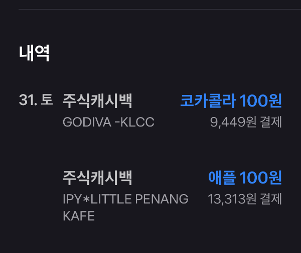 저는 토스뱅크 캐시백을 주식으로 사기로 신청해뒀더니 코카콜라와 애플 주식이 구매되었군요