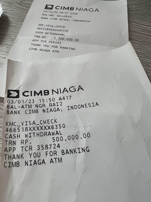 쿠알라에서는 주변에서 카드사용이 편리해서 500 또는 100 MYR 씩 수시로 인출했지만 발리에선 로컬을 주로 이용하기 위해 현금을 미리 찾아두었습니다. 발리 CIMB의 1회 최고인출 한도는 1,500,000 IDR입니다.