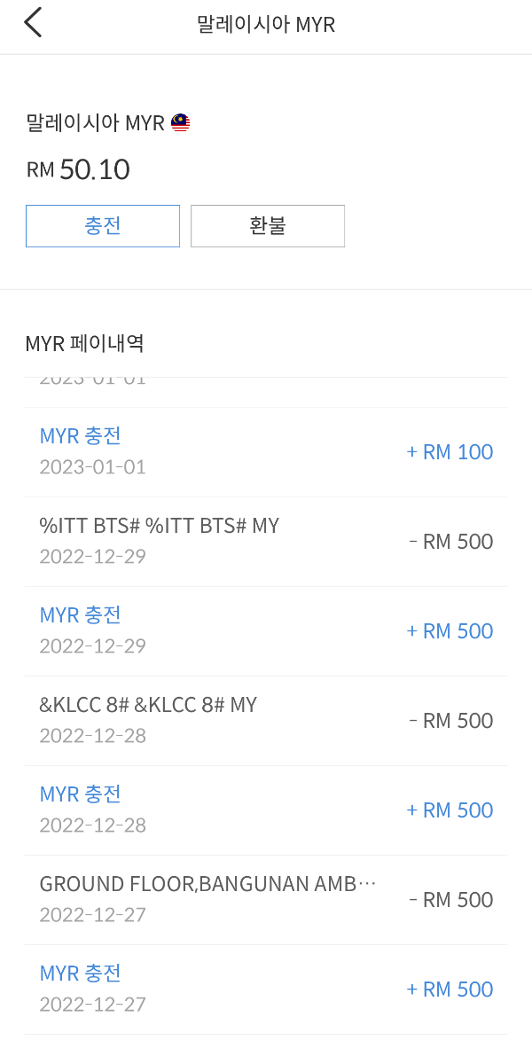 말레이지아 환율로 확인했을 때 조금씩 변하긴 하는데 12월 27일 출국당일 500링깃을 충전했을 때 144.710원, 31일에 100링깃을 28.901원이었습니다. 보통 289원 정도 왔다 갔다 하네요