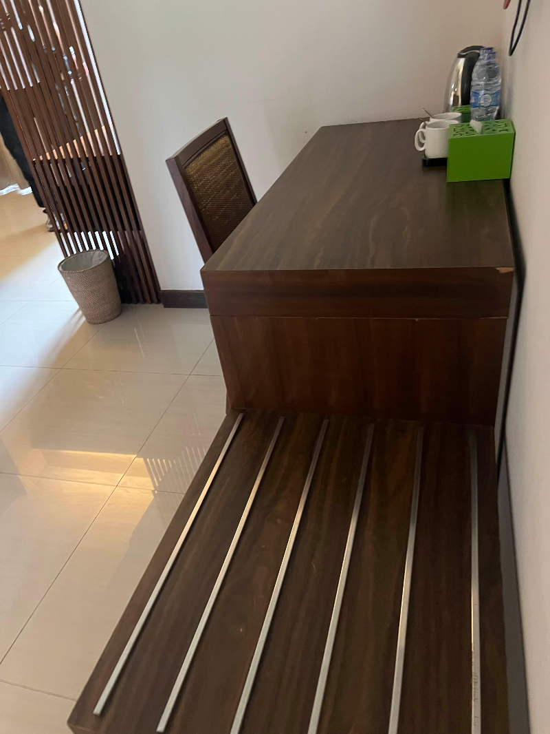 응우라라이 국제공항에서는 차로 약 20분 정도 소요되었습니다. 발리는 워낙 트래픽이 많은 곳이라 붐비는 시간에는 더 소요될 수 있어요. 여기는 가성비 호텔로 발리 여행자들의 추천이 많은 곳이기도 합니다. 룸타입이 디럭스와 프리미어룸이 있는데 디럭스는 좁다는 리뷰가 많았어요. 그래서 저는 프리미어룸을 선택했어요. 한 달 살기 짐이라서 큰 캐리어가 두 개씩이나 있어서 마음 편하게 펼쳐놓고 지내고 싶었거든요. 호텔 테라스 앳 쿠타는 이름에서 처럼 모든 객실에 테라스가 있어요. 수영장을 가운데 두고 ㄷ자형태로 객실이 있는데 모두 수영장을 바라보는 테라스입니다. 처음엔 맨 꼭대기층을 배정받았어요. 하지만 전 객실 금연구역이고 흡연자는 1층으로 내려와야 하더라고요. 남편의 흡연이슈로 흡연가능한 객실이 있는지 체크를 부탁했더니 2층방으로 변경해 주었습니다.