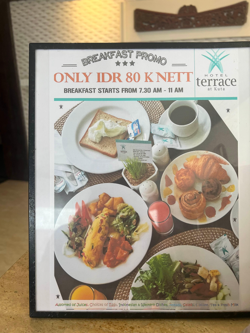 그에 비하면 이번에 머물렀던 Hotel Terrace Kuta는 여러모로 만족스러운 위치에 있는 가성비 호텔이었습니다. 호텔직원들도 항상 친절했고, 요청이 있을 때마다 빠르게 도와줘서 기분 좋게 지낼 수 있었어요. 청결함도 마음에 들었는데 매일매일 깨끗하게 정리를 해주고 공용공간들도 관리를 잘하더라고요. 수영장 이용을 제대로 못한 점이 아쉬웠지만 전체적으로 위치, 편안함, 서비스 모든 면에서 기대이상이었어요.